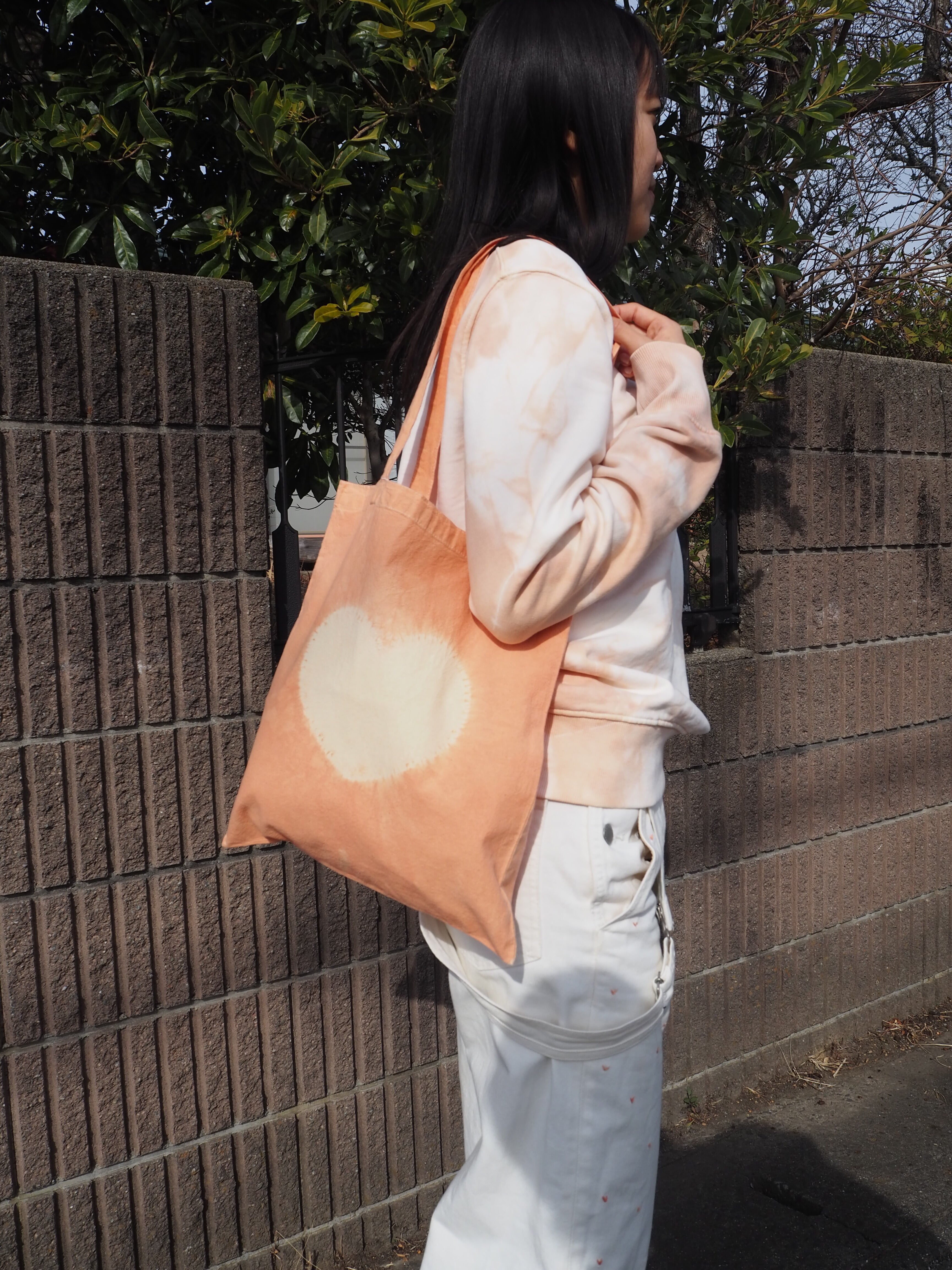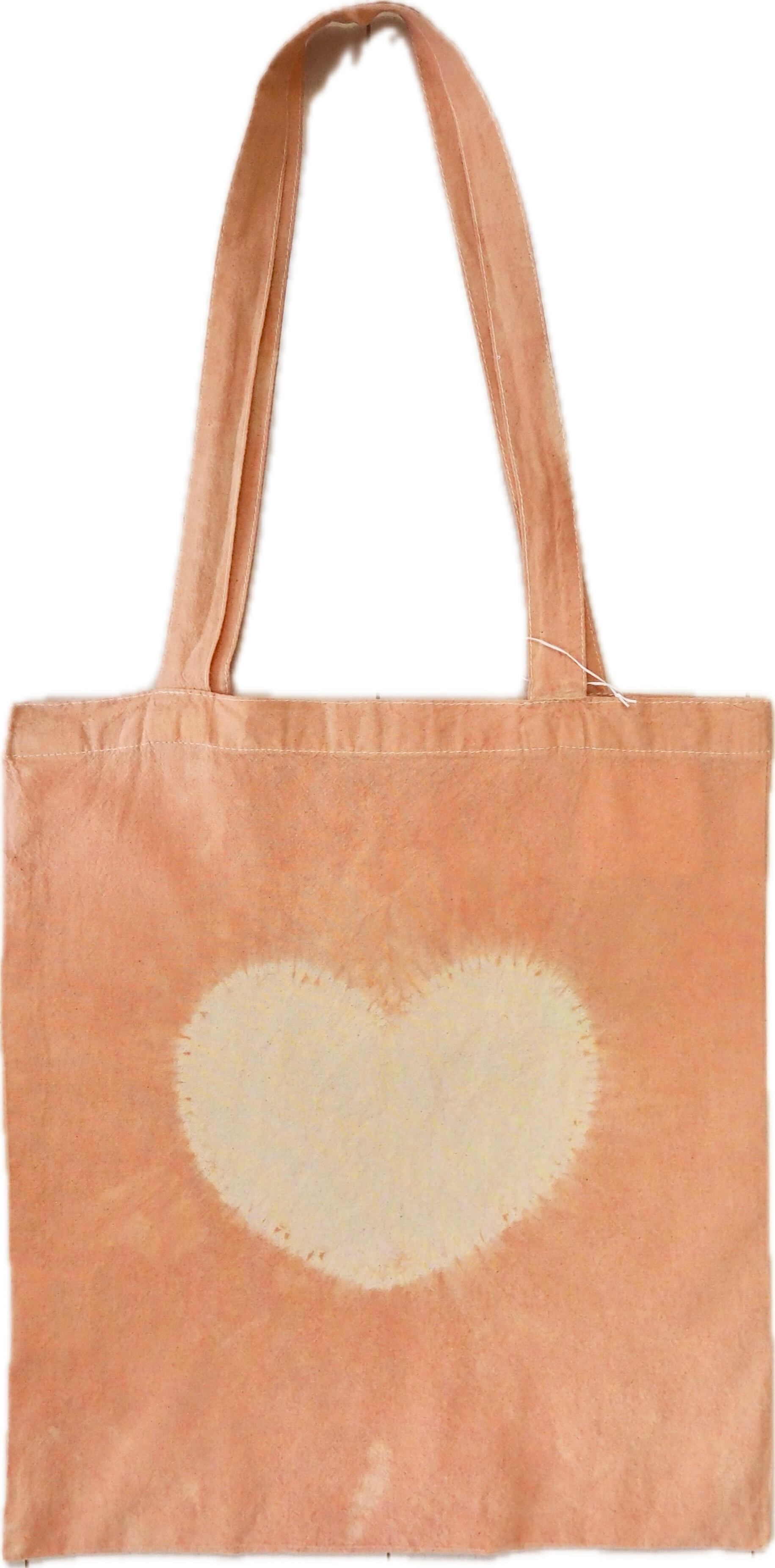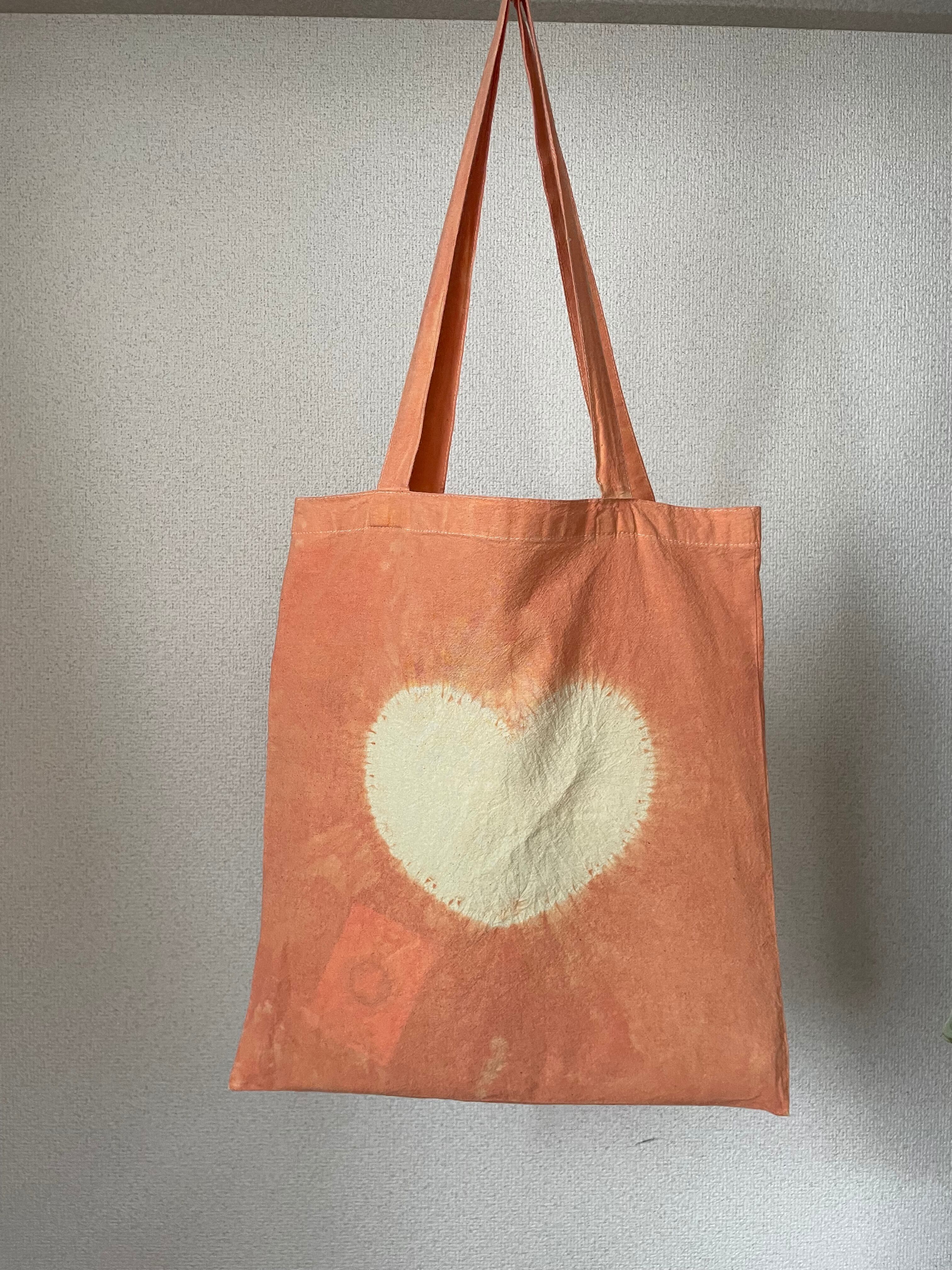 かりやすとインド茜、ハート絞り染めのオーガニックコットントートバッグ(マチなし)