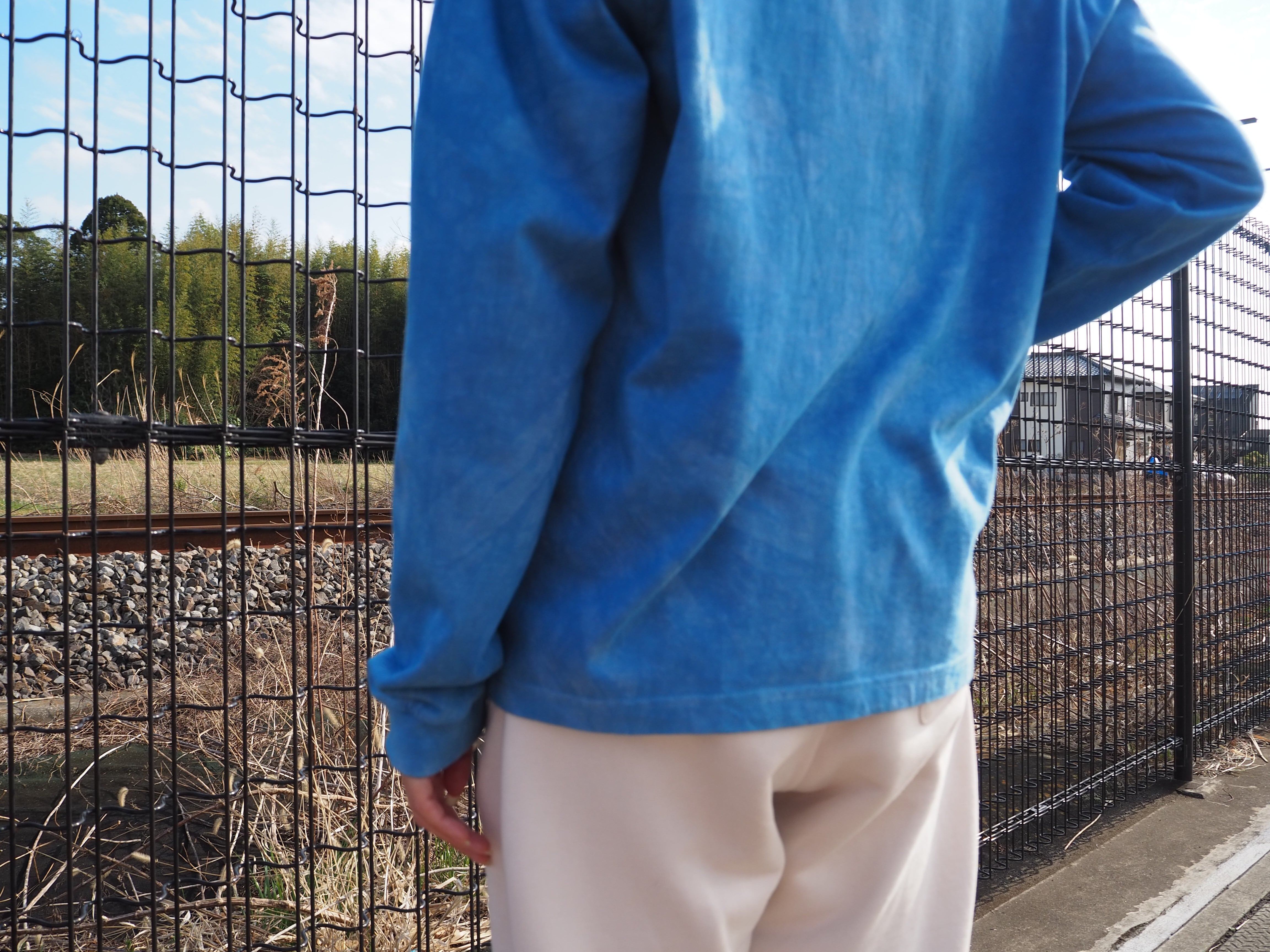 ボディの藍染めのブルーとのコントラストが個性的で、ジャケットなどの羽織も前を開けてハートをチラッと見せていただきたいと思える1着です。